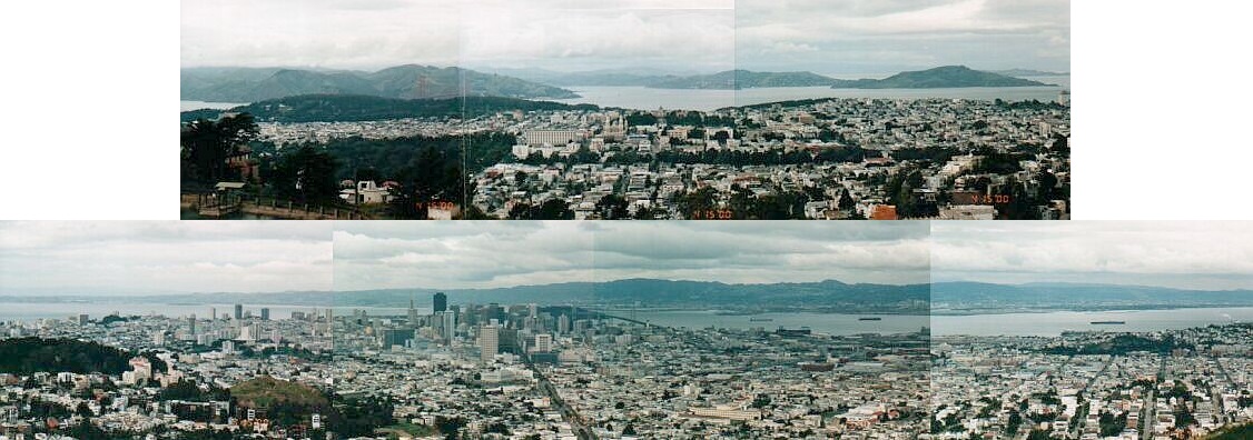 大パノラマサンフランシスコ一望。上が全体の左側。ゴールデンゲートブリッチも見えます。下が全体の右側。今度はベイブリッチが見えます。お楽しみいただけましたか?