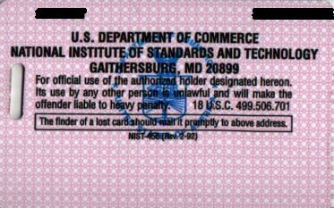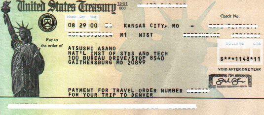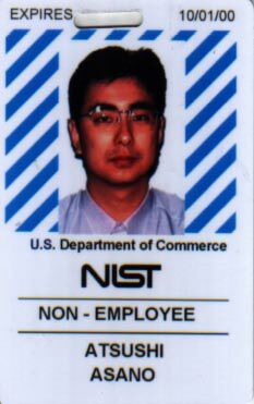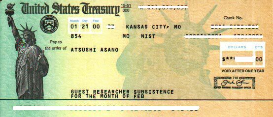 さて、最後ということで、私のボス私がこちらに来て、最初に行った観光地、Great Fallsです。ポトマック川です。場所によって岩だったり、雄大な流れだったり。対岸はバージニア州です。あちら側にいる人も見ることができます。去年(1999年)の7月にボスとボスの兄の3人で行きました。名前はグレートフォールズですが。。。。普通の滝を想像していた私は、え?と思ったんですが、これもまた良かったです。今年も行ったんですが、今年の方が水量がありました。 、私の ID私のNISTでのIDカードです。これがないと、図書館でコピーができないとか、休日(土日、祝日)にNISTに入れないとか、平日の午後7時以降NISTに出入りできないといった不便なことになります。一応、いつもつけていることが義務のようです。 カード(表)、 (裏)裏にはちゃんとNISTのIDということが書かれています. 、 給料の小切手私の給料の小切手。金額などのところは消してあります。あしからず。旅費の小切手と全く同じ。アメリカの国としての小切手は自由の女神が書かれているんですね。図は1月にもらった小切手で2月分。金額は、2000から3000ドルの間。秘密。 を公開いたします。ご覧下さい。ではでは。