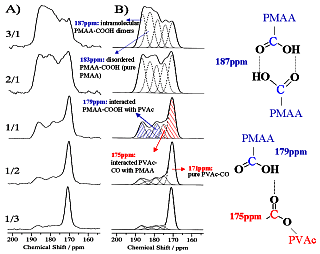 を解析する手段として、固体NMR法は非常に重要です。右図はポリマー間で水素結合が起きて相溶化する